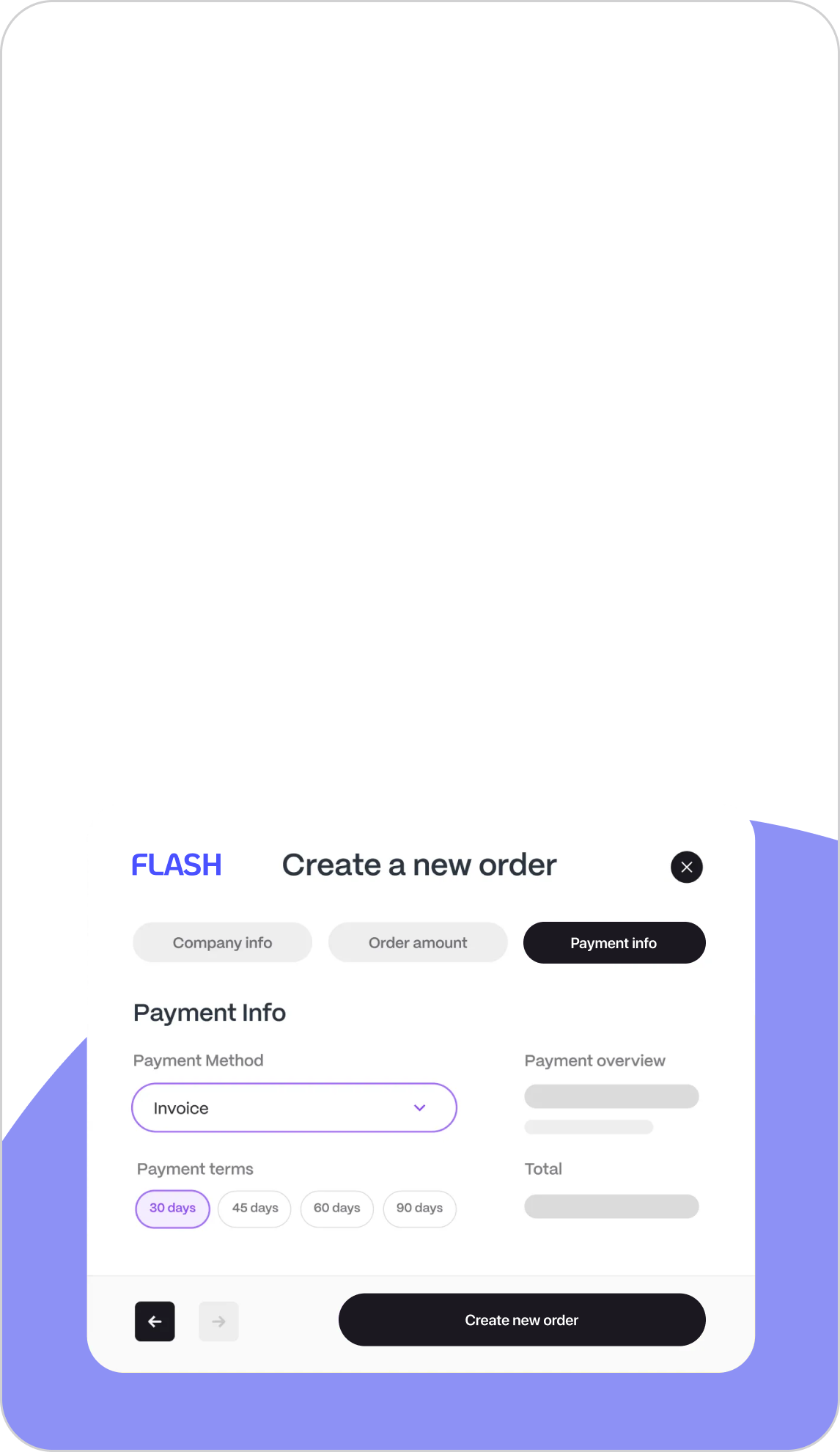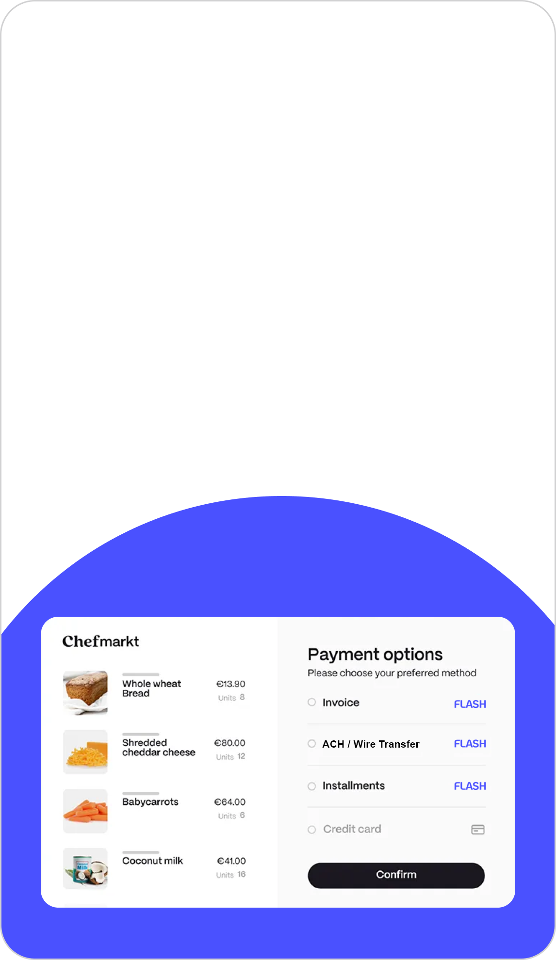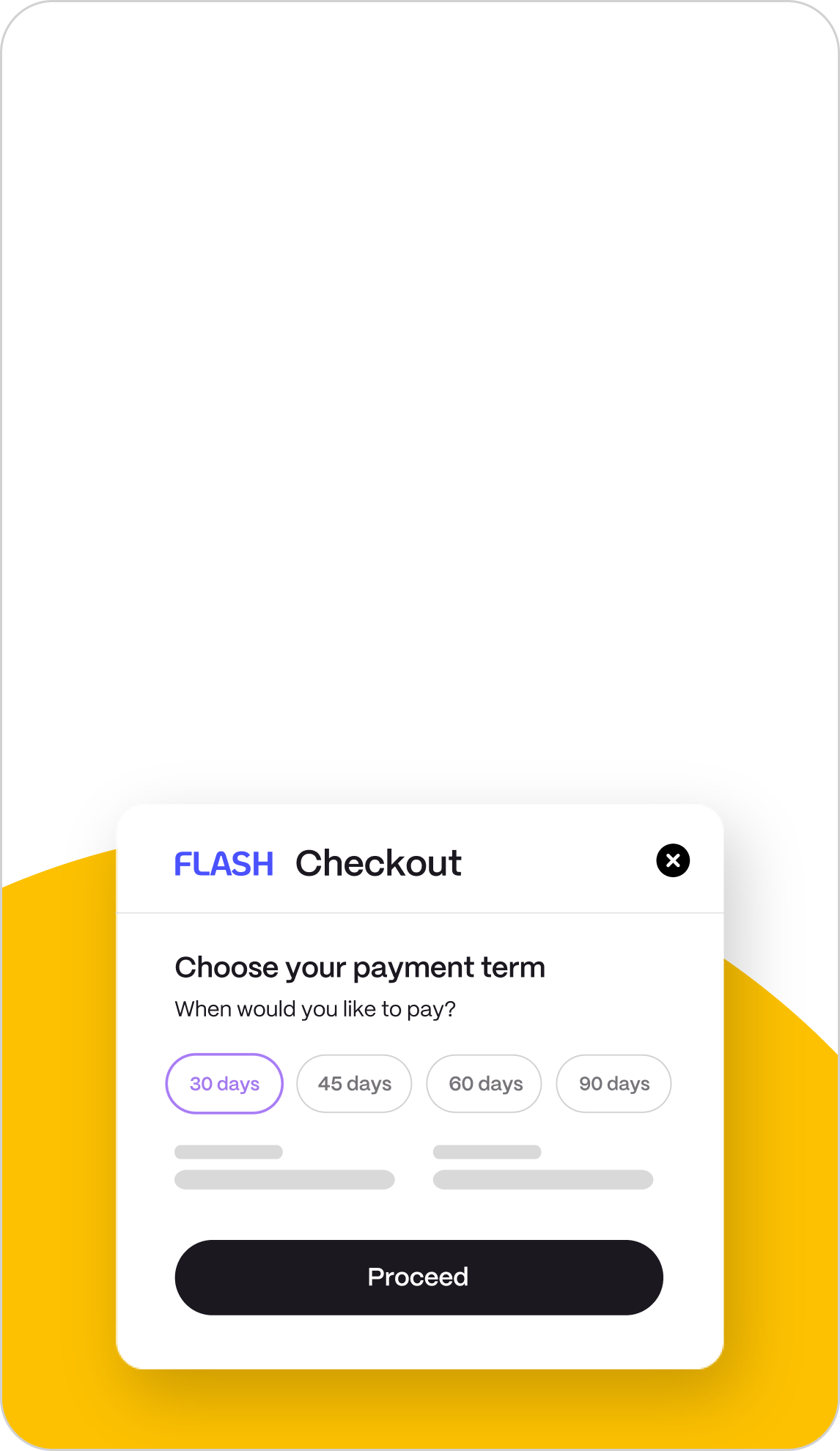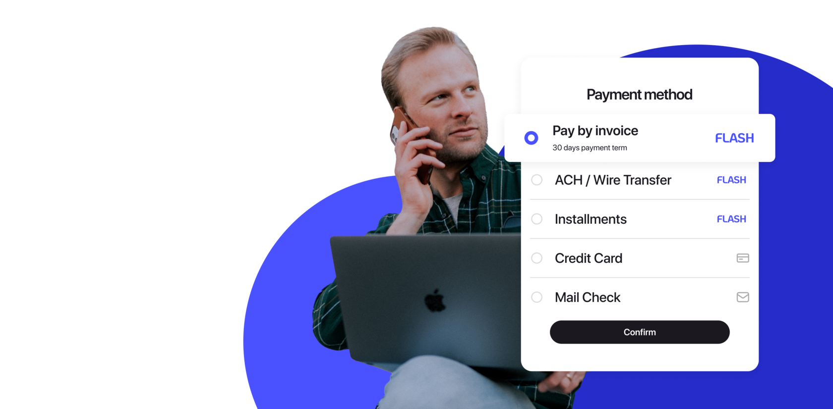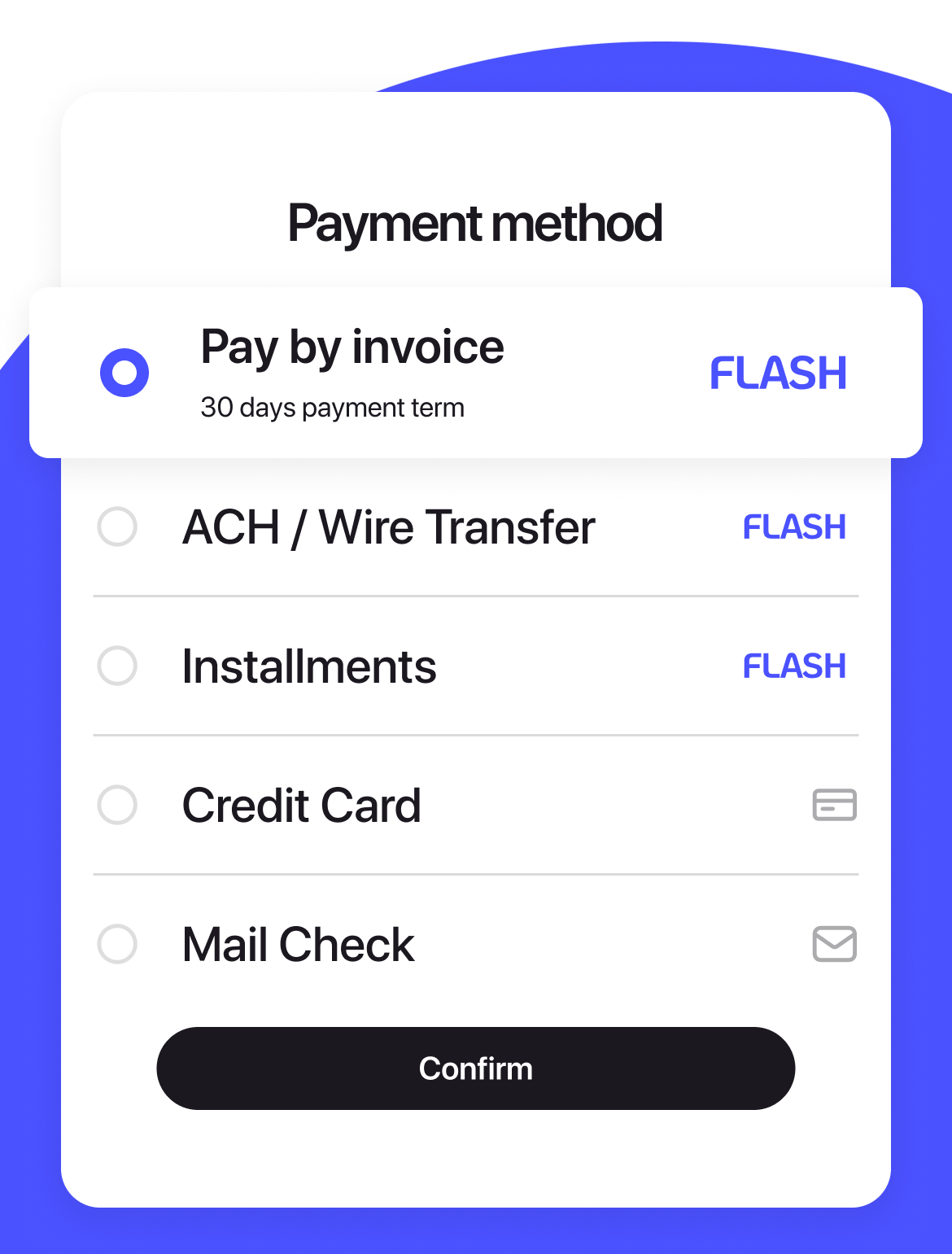 Add Flash to your platform to offer buyers flexible Buy Now Pay Later options, as well as standard net terms (30-90 days).